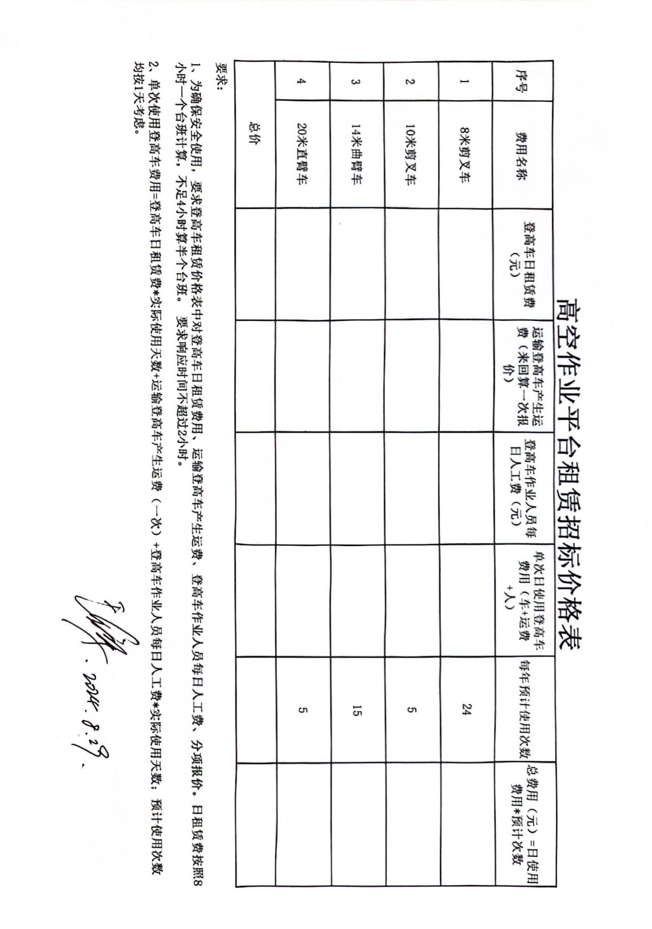 施工范围及技术要求:根据我公司需求,提供登高作业平台。报价表:见附件。